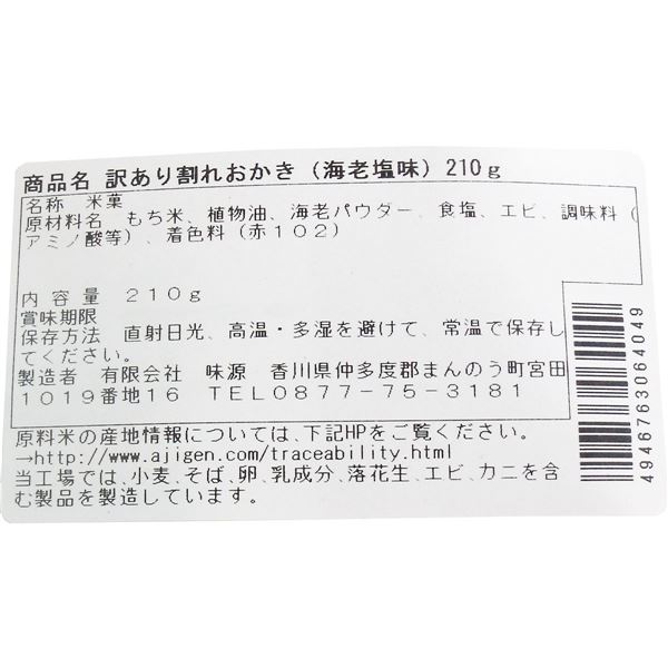 【割れおかき えび塩味の原材料】品名・名称:米菓原材料名:もち米、植物油、海老パウダー、食塩、エビ、調味料(アミン酸)、着色料(赤102)栄養成分表示:100gあたりエネルギー:412kcaL、水分:3.2g、たんぱく質:8.2g、脂質:6.1g、炭水化物:81.0g、灰分:1.5g、ナトリウム:489mg、食塩相当量:1.2g【栄養成分】品名・名称:米菓原材料名:もち米、植物油、海老パウダー、食塩、エビ、調味料(アミン酸)、着色料(赤102)栄養成分表示:100gあたりエネルギー:412kcaL、水分:3.2g、たんぱく質:8.2g、脂質:6.1g、炭水化物:81.0g、灰分:1.5g、ナトリウム:489mg、食塩相当量:1.2g【注意事項】・当工場では、小麦、そば、卵、乳成分、落花生、エビ、カニを含む製品を製造しています。